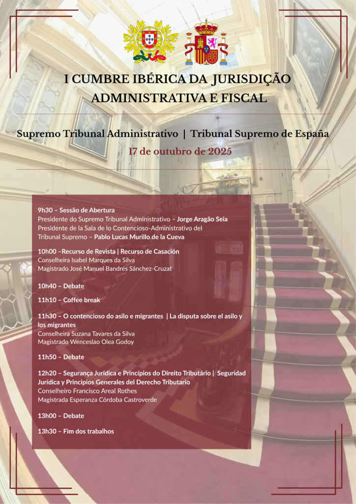 Nos dias 16 e 17 de outubro de 2025, Lisboa será palco da primeira Cumbre Ibérica da Jurisdição Administrativa e Fiscal, uma iniciativa conjunta do Supremo Tribunal Administrativo de Portugal e do Tribunal Supremo de España.