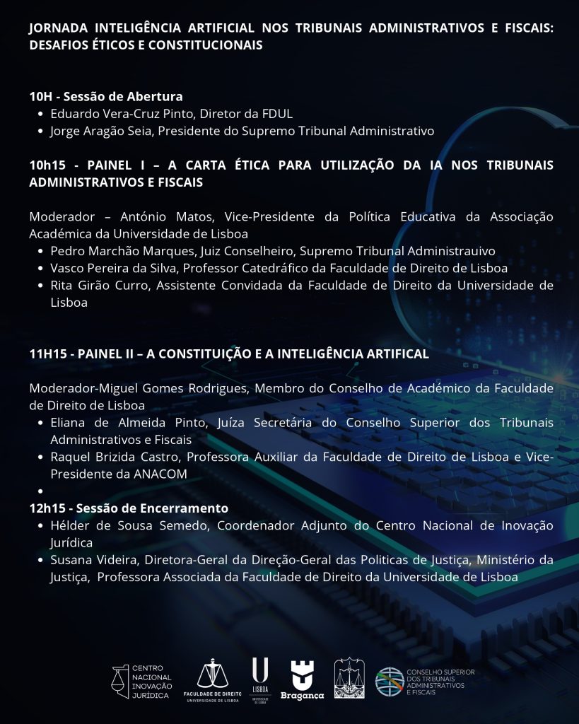 O primeiro painel – A carta ética para utilização da IA nos Tribunais Administrativos e Fiscais contará com a presença do Juiz Conselheiro do Supremo Tribunal Administrativo Pedro Marchão Marques. No segundo painel – A Constituição e a Inteligência Artificial participará a Juíza Secretária do Conselho Superior dos Tribunais Administrativos e Fiscais, Eliana de Almeida Pinto.